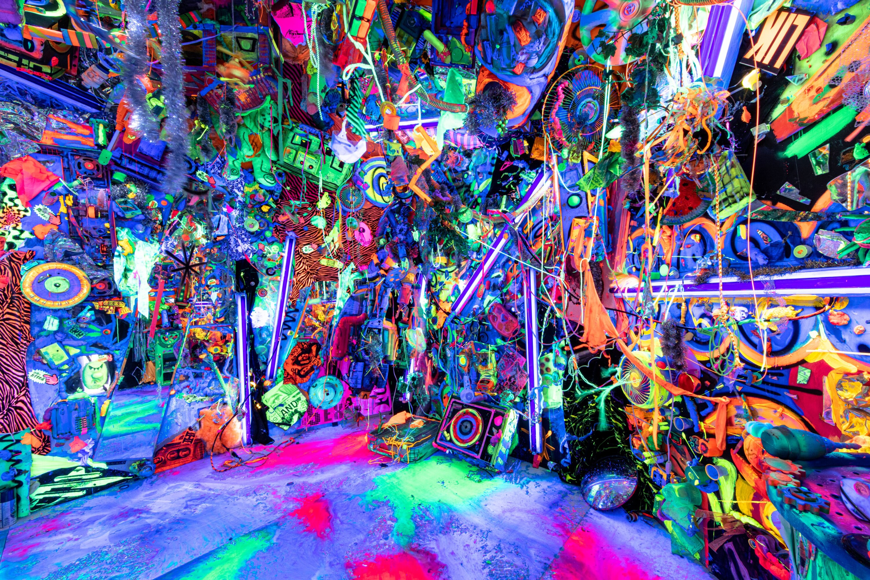Scharf’s Cosmic Cavern has been a living, evolving work since he first presented it in 1981 — the year he and Haring shared a studio. Objects fill every surface of a darkened room and blaze to life under black light: you don’t look at it so much as fall into it. Reconfigured especially for this exhibition, it remains one of the most iconic works in Scharf’s oeuvre.