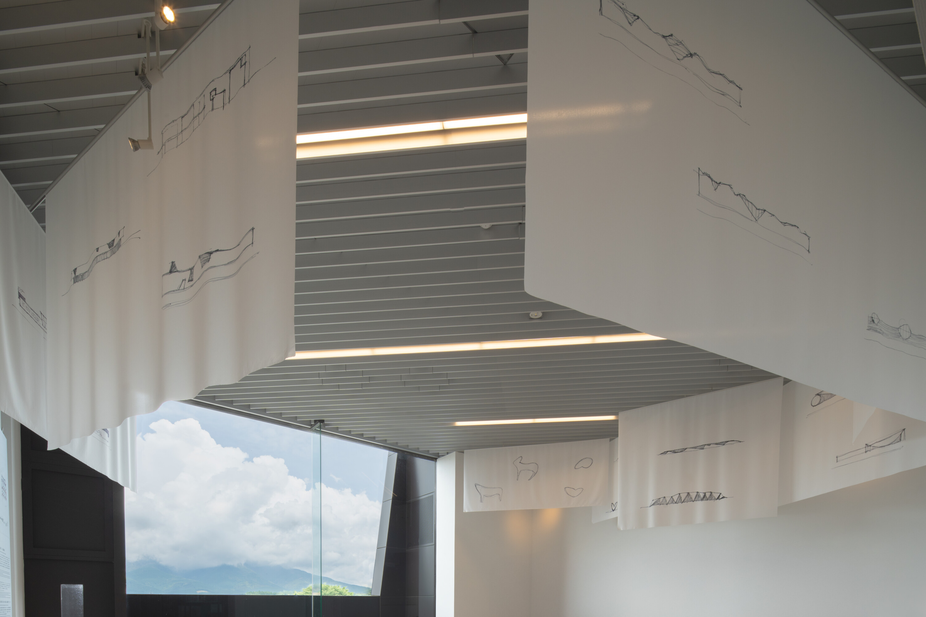2018年に竣工。山岳景観や馬の姿にインスピレーションを得たファサードや水の造形を取り入れた駅前広場の屋根など、八ヶ岳の自然や小淵沢の文化と深く結びつく建築。室内から効果的に景観を切り取る窓を備える交流スペースを会場に、ドローイングでの演出や北杜市に点在する北川原建築を紹介します。